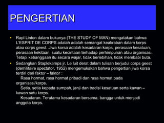 Mampu kompak dan solid untuk membangun suasana teamwork jiwa korsa yang konstruktif. 1 Sebagai contohnya saya ambil dari sekelompok anak punk. Jiwa korsa adalah kesadaran korps perasaan kesatuanatau corps geest.